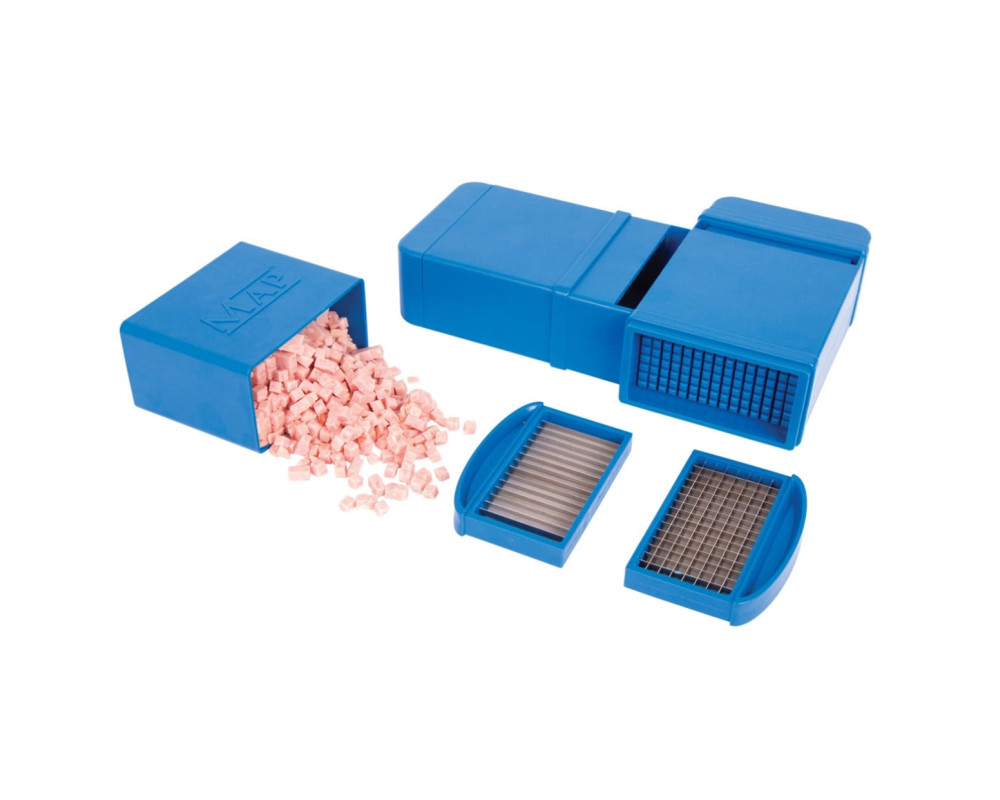 Díky možnosti variabilního nastavení kráječe doplněného nerezovým ocelovým ostřím je opravdu radostí s ním pracovat. Unikátní dávkovač zamezí zbytečnému plýtvání a zároveň dopomáhá k jednoduché obsluze při docílení malých masových nástrah ve tvaru kostiček. Specifikace: - unikátní design - vyrobeno ze super odolného plastu ABS - včetně jedné velikosti kráječe z nerezové oceli - lze mýt v myčce - odnímatelný sběrník - barva: modrá