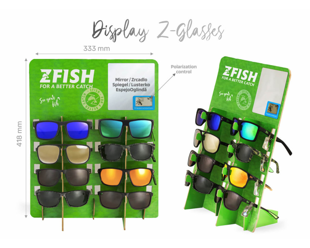 Ideální pomocník pro dokonalou prezentaci našich nových vyladěných brýlí. Kvalita materiálu a zpracování tohoto stojanu spolu s elegantním zeleným ZFISH designem zajistí, že se na Vaší prodejně rozhodně neztratí a jsme si jistí, že neunikne pozornosti žádného zákazníka. Součástí displeje je zrcadlo a samolepka s testem polarizace.