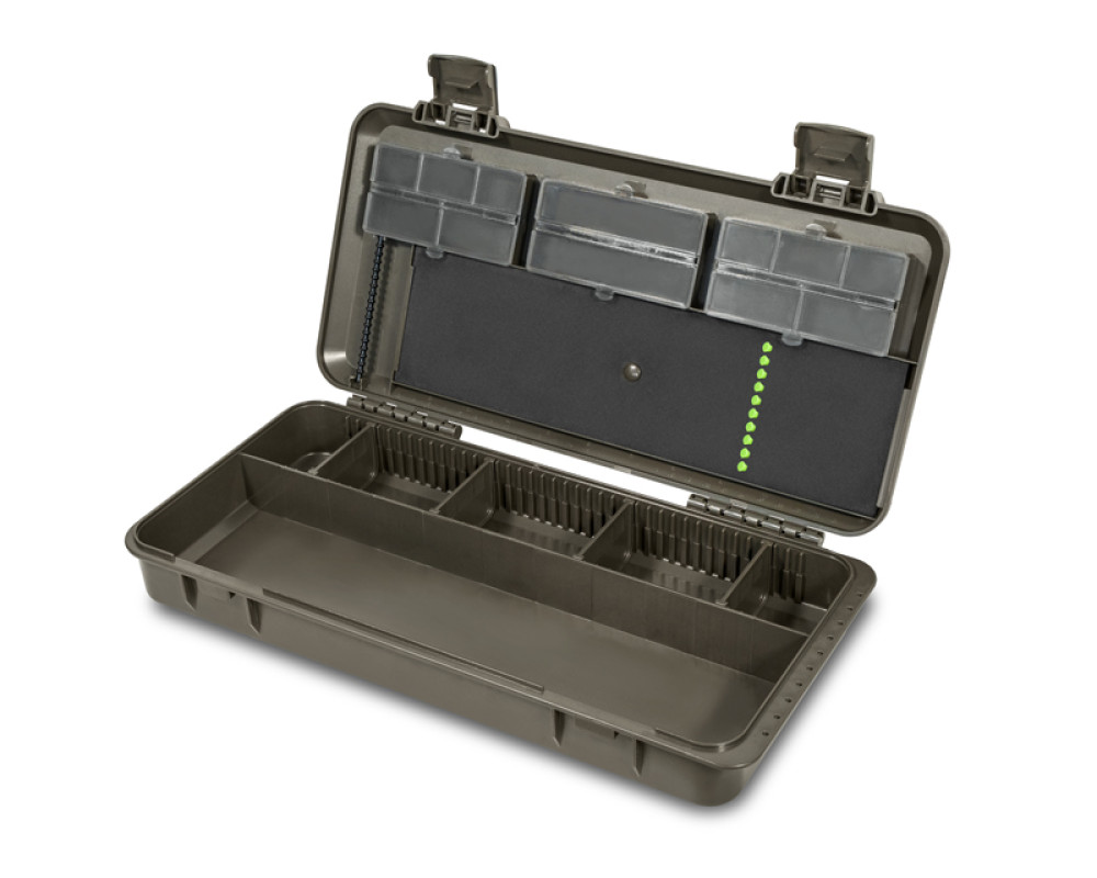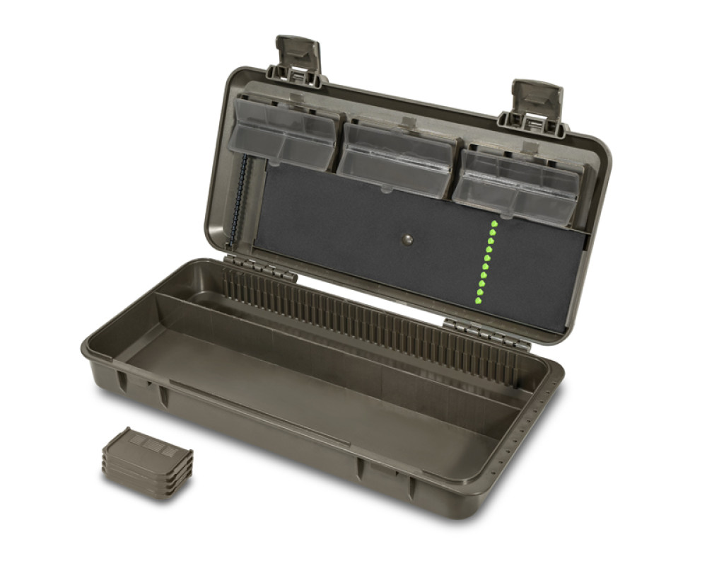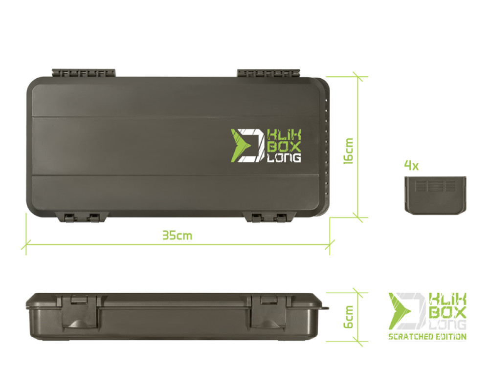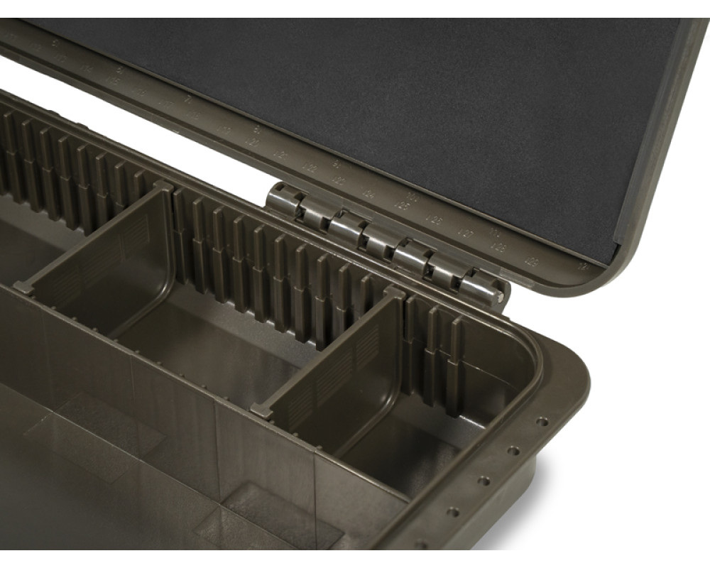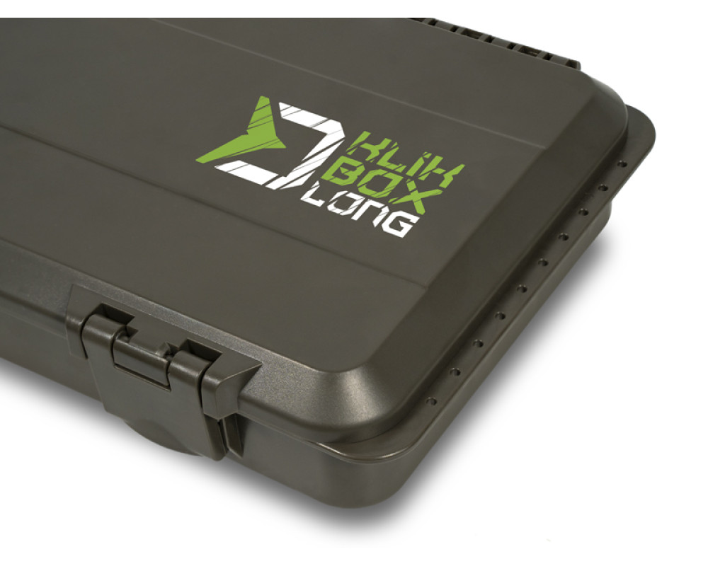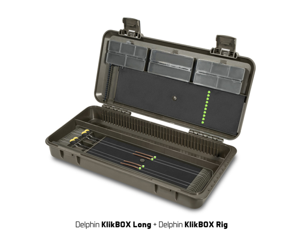 KlikBox Long je navíc vybaven platem z tvrzené pěny a špendlíky pro pohodlné uchycení koncových montáží. Podél celého odkládacího prostoru na návazce naleznete měřítko, podle kterého si budete umět přesně určit délku vašich koncových montáží. Organizér je vyroben z velmi odolného plastu a k jeho komfortnímu otevírání a uzavírání poslouží dva pevné plastové klipy.