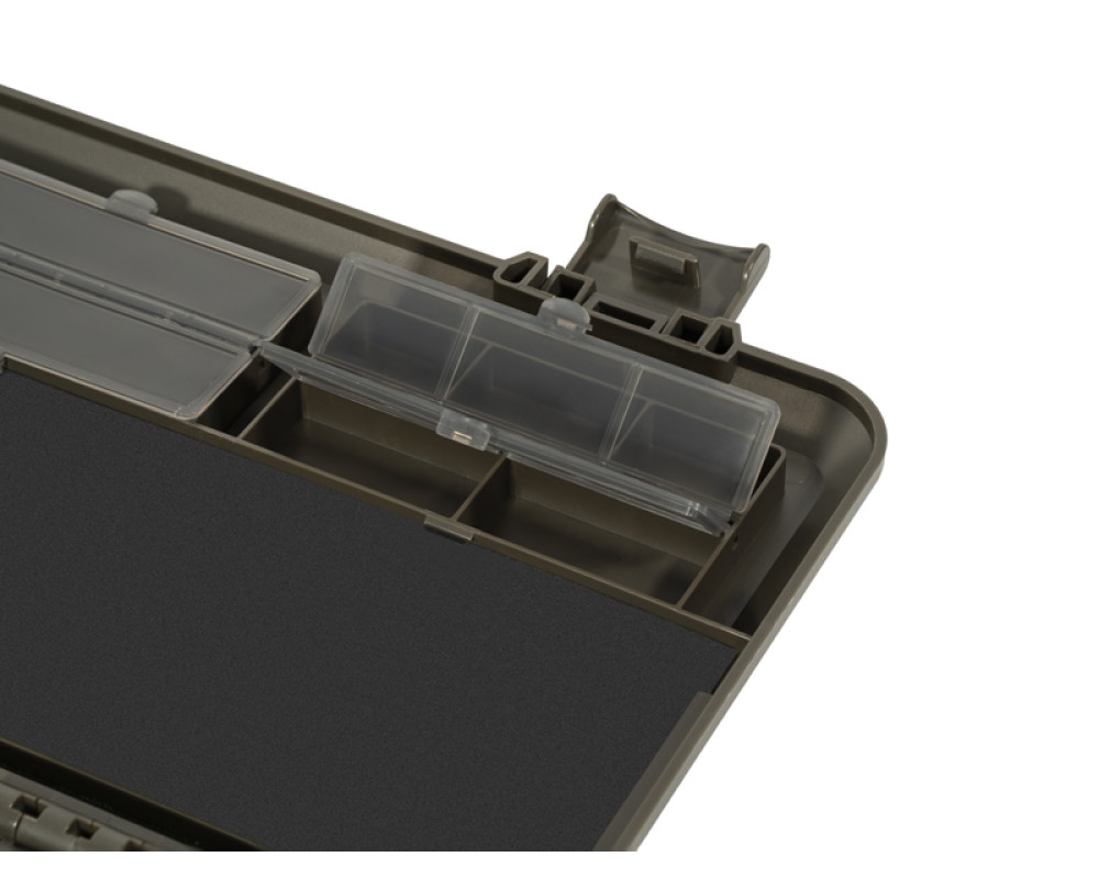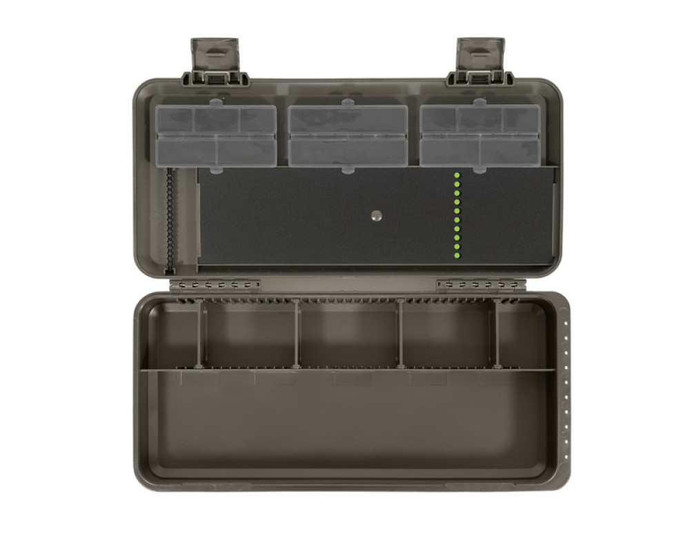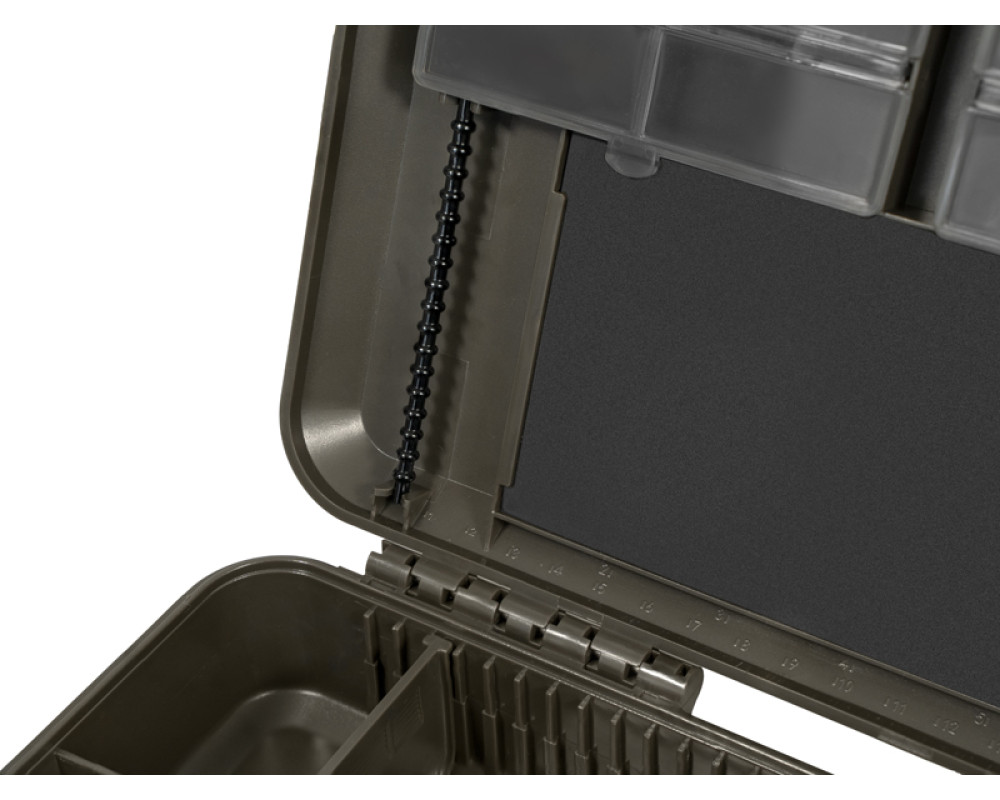 Spodní část organizéru je rozdělena na dvě sekce. První poskytuje největší úložný prostor, ideální pro uložení například utahovače uzlů, jehel, nůžek či jiného příslušenství. Bez problémů se do ní vejde i organizér na návazce KlikBOX Rig, který není součástí balení, ale je možné si jej samostatně dokoupit. Druhá sekce je navíc rozdělena polohovatelnými přepážkami, díky kterým si můžete prostor přizpůsobit přesně podle vašich potřeb.
