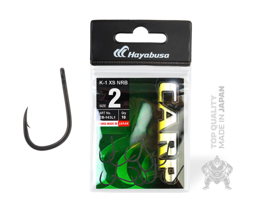 Háček Hayabusa K-1 XS s širokým obloukem a se zesíleným drátem – extrémně odolný háček pro těžké podmínky a lov velkých kaprů. Zvětšuje dosah při záběru a zajišťuje jisté zaseknutí i v hustší vegetaci nebo ztížených podmínkách. Skvěle se hodí pro lov kaprů na boilies a pelety, ale i pro použití s většími měkkými nástrahami. Jsou vhodné jak pro klasické kaprové montáže, tak i pro moderní prezentace nástrah.