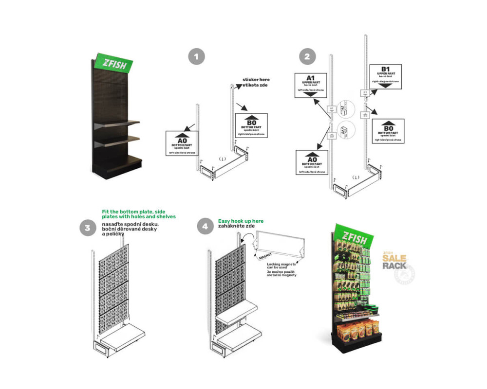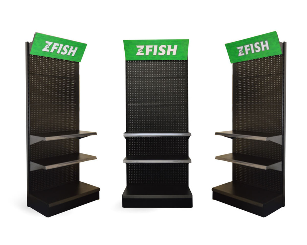 ZFISH Stojan Sales Rack je pevný a stabilní prodejní regál, který je ideálním pomocníkem pro naprosto dokonalou prezentaci našich nových vymazlených produktů prémiové řady "3FISH". Nekompromisní kvalita materiálu a zpracování těchto stojanů spolu s elegantním černo-zeleným ZFISH designem zajistí, že se na Vaší prodejně rozhodně neztratí a jsme si jistí, že neunikne pozornosti žádného zákazníka. Regál disponuje velkou děrovanou plochou k zavěšení produktů na klasické prodejní háčky, a je dále opatřen dvěmi libovolně umístitelnými policemi a i samotná podstava tvoří polici a umožňuje vystavit další produkty. Součástí balení těchto ZFISH regálu jsou samozřejmě i samotné závěsné háčky. Stojany jsou navržené a vyrobené tak, aby šli snadno propojit a seskládat vedle sebe.