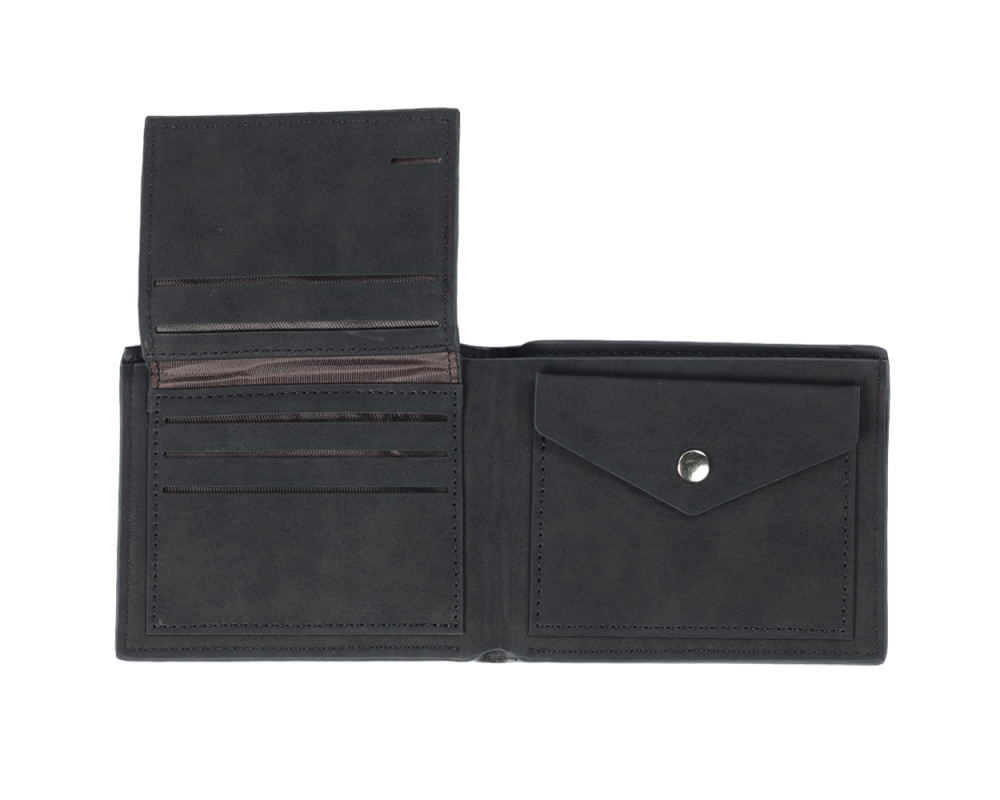 Peněženky jsou vyrobeny z kvalitní syntetické kůže a jsou velmi příjemné na dotyk. Členění peněženky: - 5 přihrádek na karty - 1 průhledná přihrádka na fotky nebo doklady - 2 přepážky na bankovky - 1 velký mincovník - Rozměry: 12 x 9,5 x 3 cm - Materiál: syntetická kůže - Barva: černá