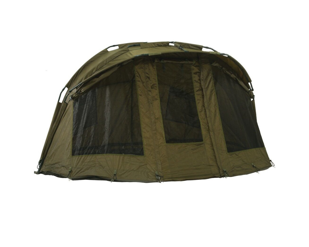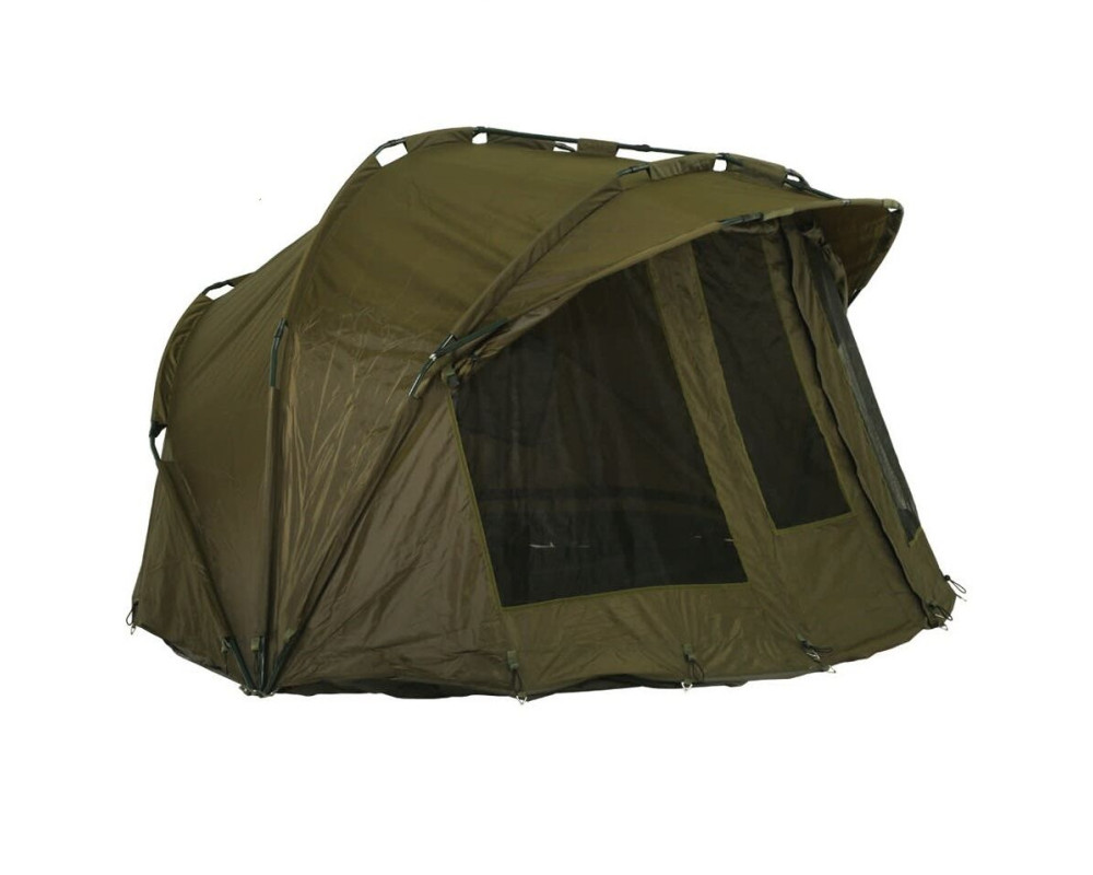 Na tento bivak byl použit vodě odolný materiál 210D té nejvyšší kvality 10 000mm srážek, který je 100% nepromokavý. Páskou podlepené švy a ukotvení na zavrtávací kolíky, které jsou v ceně přístřešku. Bivak je vybaven větracím systémem jak v přední části, tak v zadní je jeden velký otvor, který zajistí maximální odvětrání. Velký přední kšilt nad vchodem, je navíc osazen dvěma praktickými úchyty na pruty. Konstrukce bivaku je vyrobena z aluminiové slitiny a pro maximální stabilitu, jsou přidány čtyři polohovatelné rozpěrné tyče. Přední vchodová část má, tři výměnné panely na suchý zip, celo zakrytá, nebo slídová a moskytiéra. Tento přístřešek je dodáván se zesílenou pogumovanou odnímatelnou podlážkou, která se uchytí k bivaku klasickým zipem. Díky svým obřím rozměrům je bivak určen pro dva až tři rybáře. Rozměry: Délka: 320cm Šířka: 310cm Výška: 170cm Hmotnost: 15kg Transportní rozměr: 125x25x25cm