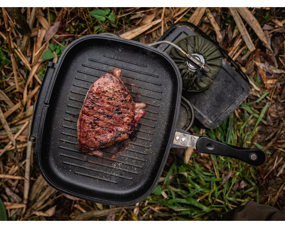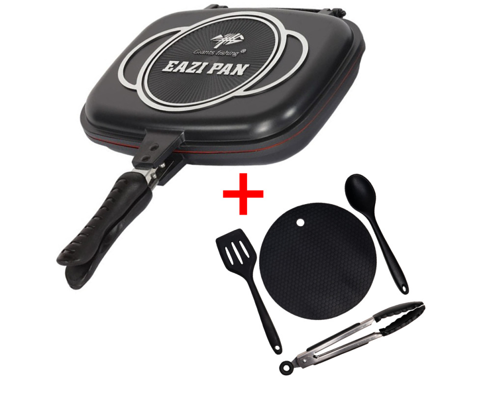 Oboustranná pánvička od Giants fishing s nepřilnavým povrchem Non-Stick , silikonovým těsněním a v krásném designu, je důležitou součástí každého rybáře kuchaře. Nyní zdarma praktická sada nádobí pro snadnou přípravu jídla v přírodě. Silikonová sada, která má nepřilnavý povrch, který se snadno čistí.